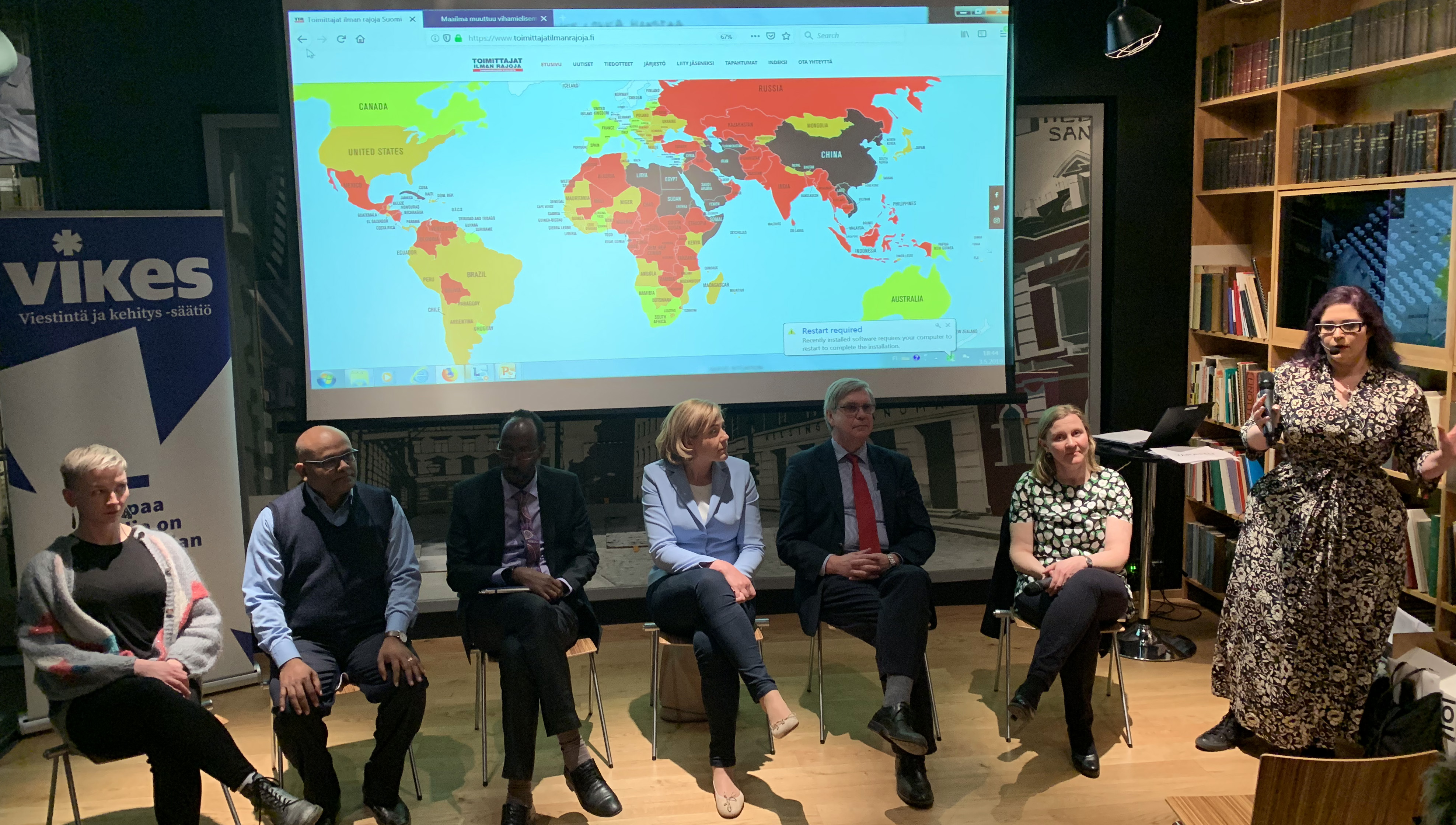 Lehdistönvapauden päivän tilaisuudessa puhuivat muiden muassa Anni Saastamoinen (vas.), Mojibur Doftori, Liban Abdi Ali, Henna Virkkunen, Jarmo Mäkelä, Auli Starck ja Maria Pettersson.”Maailmalla Suomesta tiedetään koulutus ja vapaus”, sanoi Vikesin toiminnanjohtaja Auli Starck avatessaan kansainvälisen lehdistönvapauden päivän tilaisuutta Päivälehden museossa Helsingissä 3. toukokuuta.